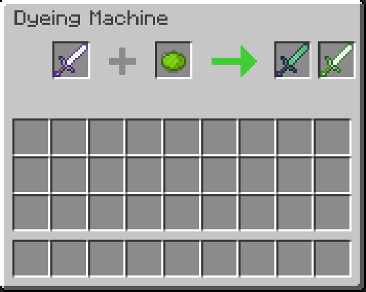 The Dyeing Machine can be used to dye the enchantment glow of items & the items themselves. The coloring of the enchantment glow should work for any item, the coloring of the item itself will only work for items that don’t “color themselves” already. If you wanna remove the dye from an item just put it into the left slot without putting a dye into the right one. If you want the default enchantment glow back just use purple dye. Armor can also be dyed and will also be colored when worn.