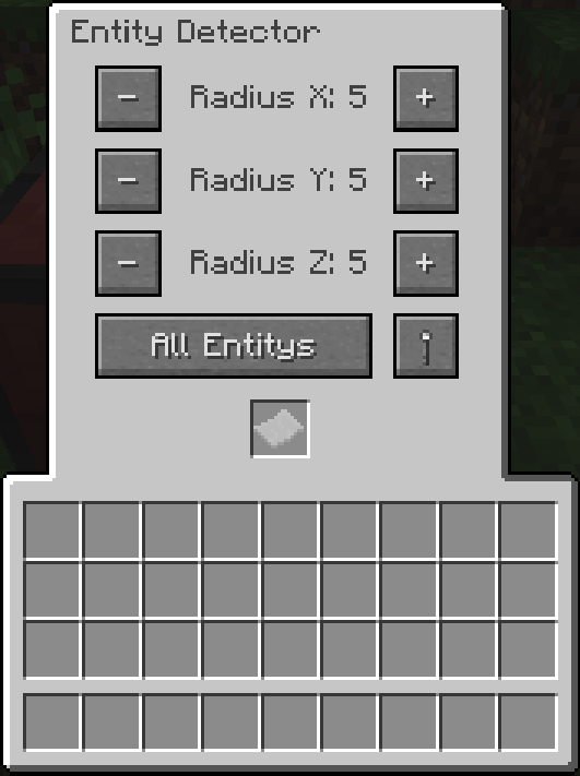 The Entity Detector is a block that emits a redstone signal if it detects a certain type of entity in a configurable radius around it. If you right click on the block it will open a gui in where you can change the radius & the type of entity the detector is supposed to react to. You can also invert the filter (If you invert “Players” the detector will emit a redstone signal if any entity that is NOT a player is inside of its radius). If you set the Filter to Custom the block will use the Entity Filter in its inventory slot as its filter.