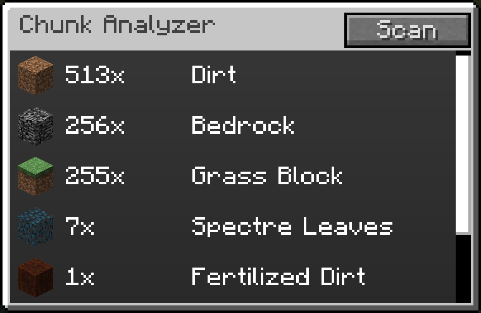 The Chunk Analyzer allows you to check what blocks a chunk contains. Open its gui and press Scan. After a few seconds you will get the results for the chunk you are in.